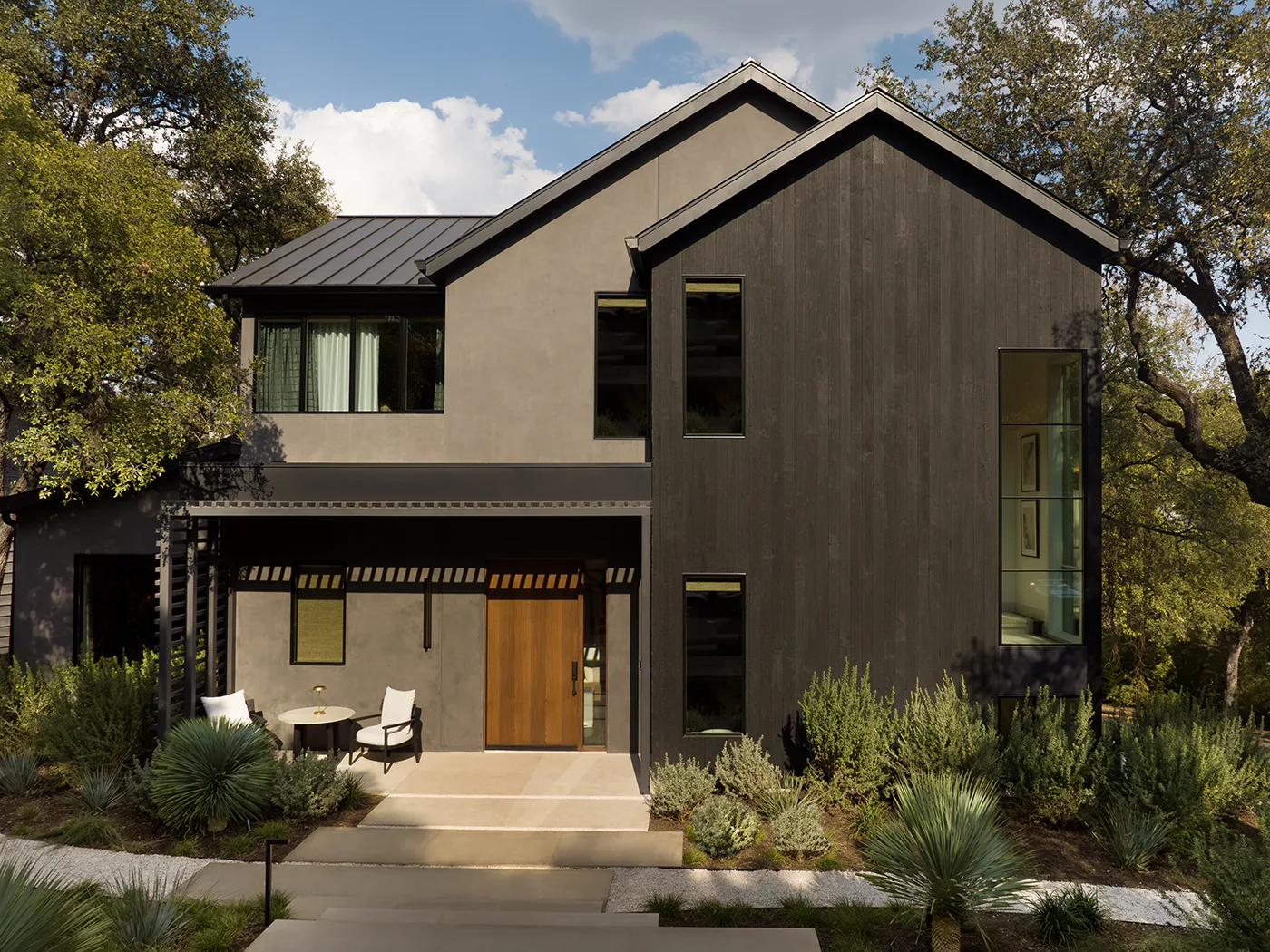 A wooded, irregular lot in Austin’s Deep Eddy neighborhood hosts this custom 3,800 sq ft contemporary home. The architect drew inspiration from Austin's creative arts scene and the site’s unique challenges. With many trees boasting protected or heritage status under Austin’s urban forestry policies, the design prioritized preserving trees from canopies and root systems. The 950 sq ft deck features a curved edge and railing to mirror both the property boundary and tree lines. It was built using TimberTech Vintage Collection® Advanced PVC Decking in English Walnut® was chosen for its natural wood appearance, seamlessly blending with the site. Located in a Wildland Urban Interface (WUI) zone, the project benefits from decking that is ignition resistant, WUI compliant, and has a Class A Flame Spread Rating. TimberTech offered technical support and connected a specialist to bend the Classic Composite Series® Railing, ensuring a perfect fit to the deck's arc.