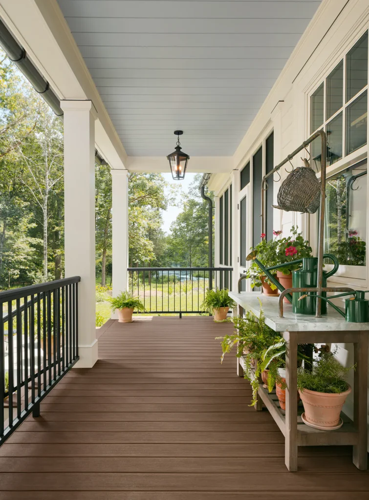 The ceilings beneath the upper deck and front porch were finished with Alpine Collection Trim from TimberTech’s sister brand, AZEK Exteriors. This durable PVC material conceals exposed structural elements while perfectly complementing the decking above.